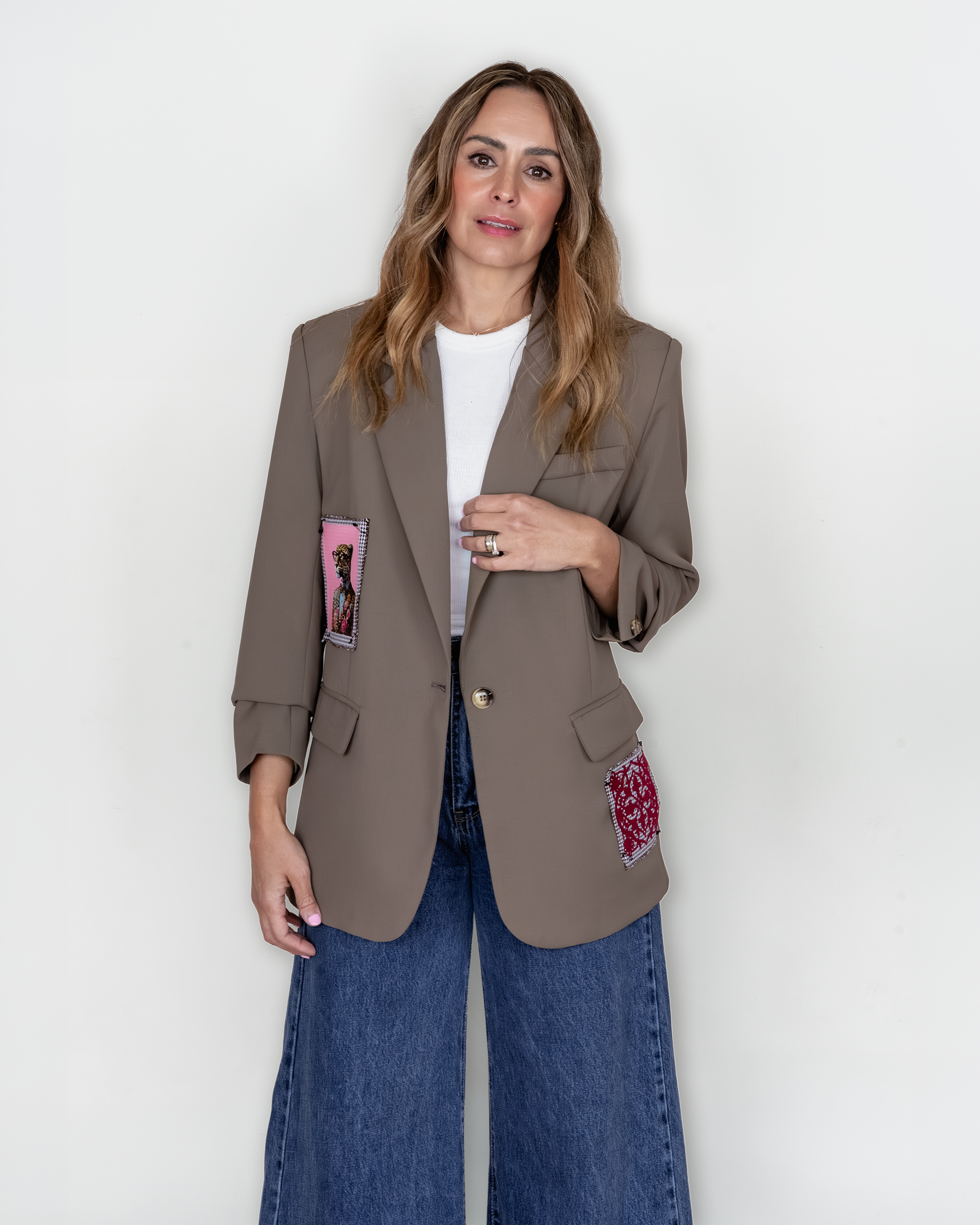 Blazer café capuchino, con prendedores. El corte de este producto es grande así que te recomendamos pedir una talla menos a la que tu eres.